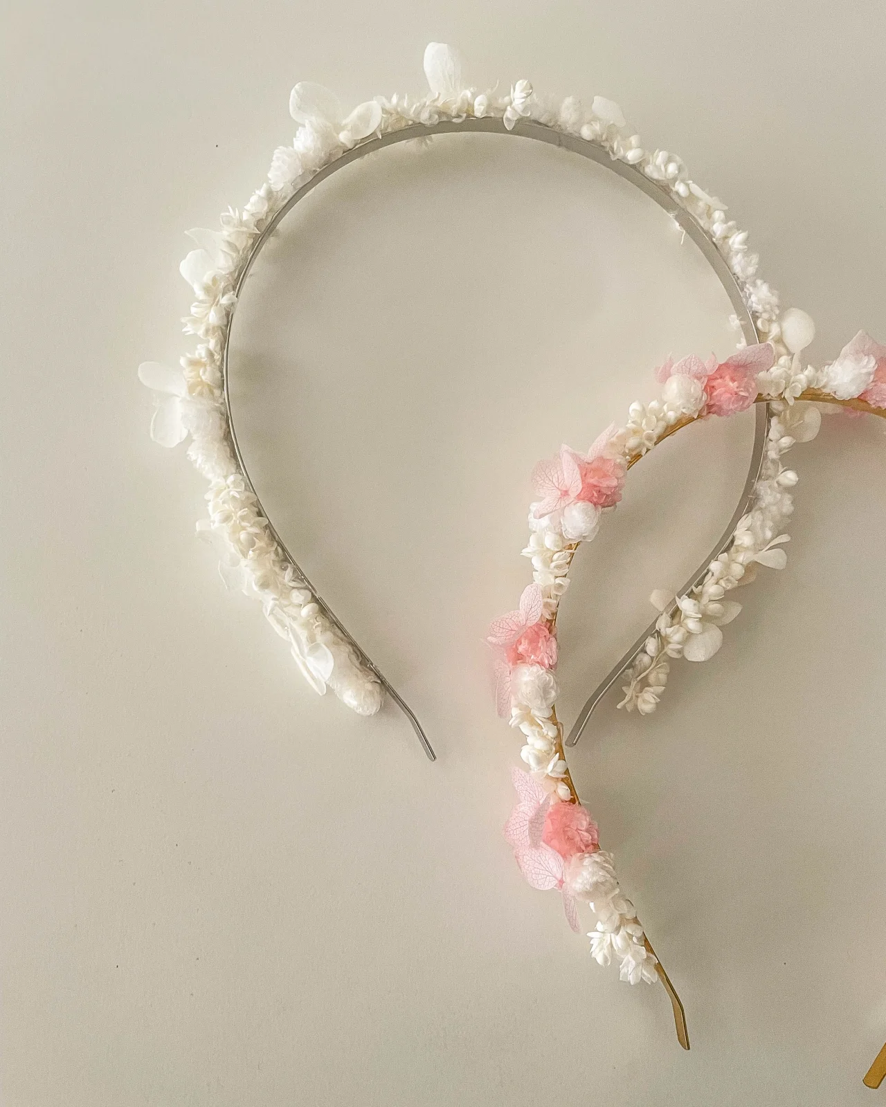 Bandolete de flores secas e preservadas fina em branco ou branco e rosa.
