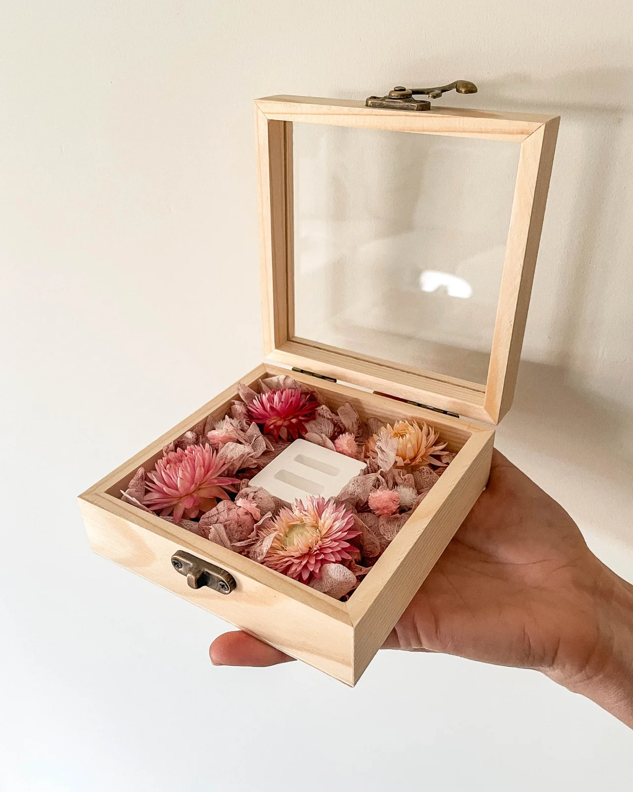 Porta-alianças em madeira com flores secas e preservadas.