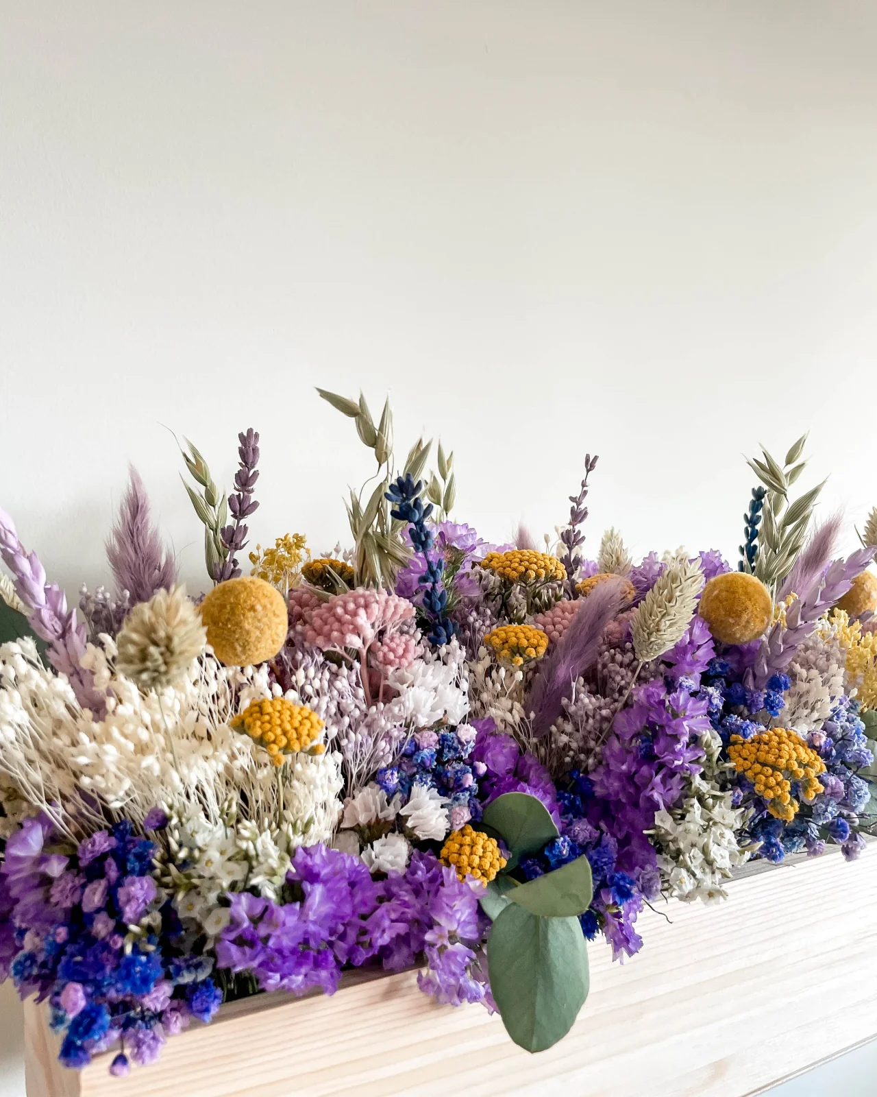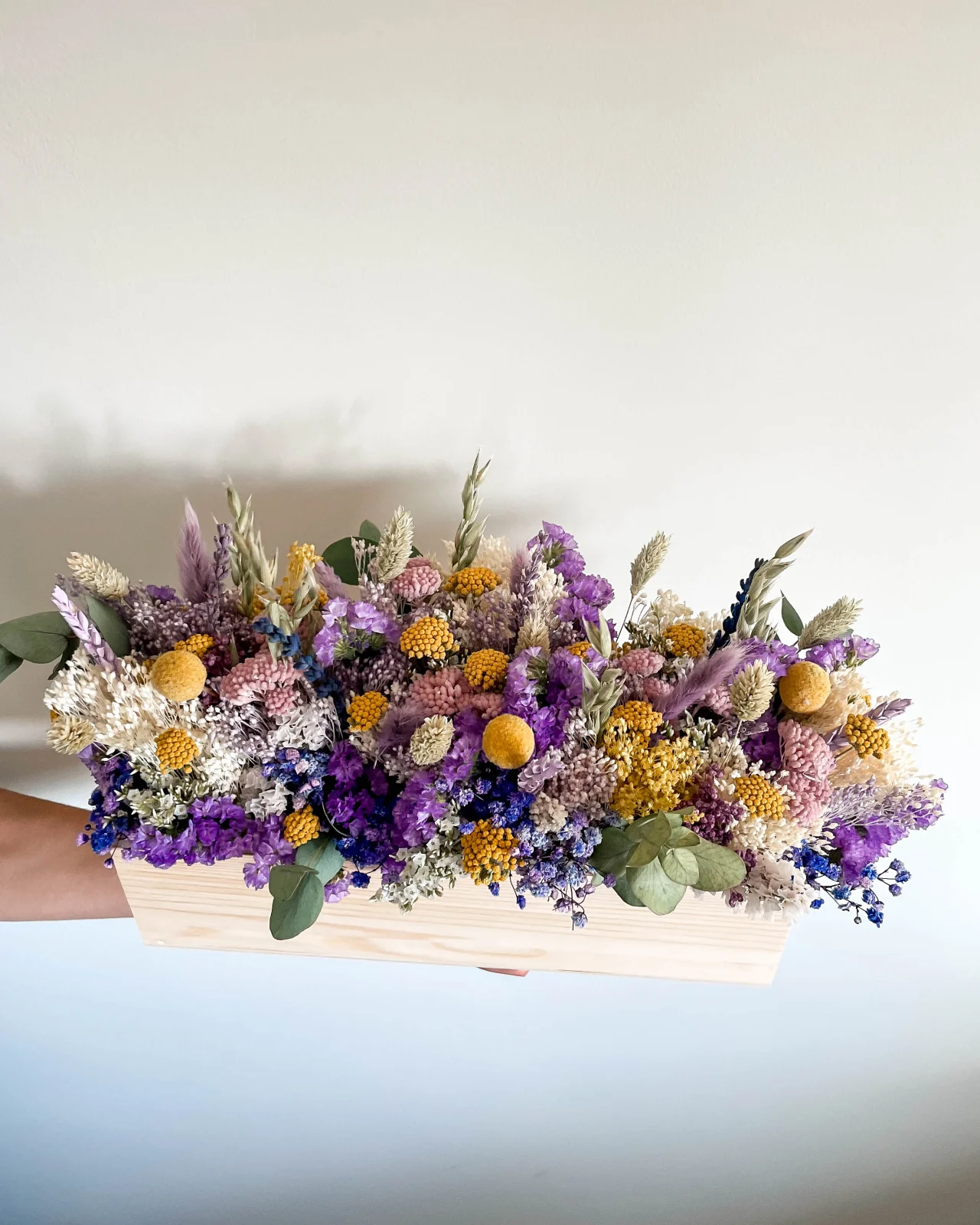 Caixa de madeira com arranjo de flores secas e preservadas.