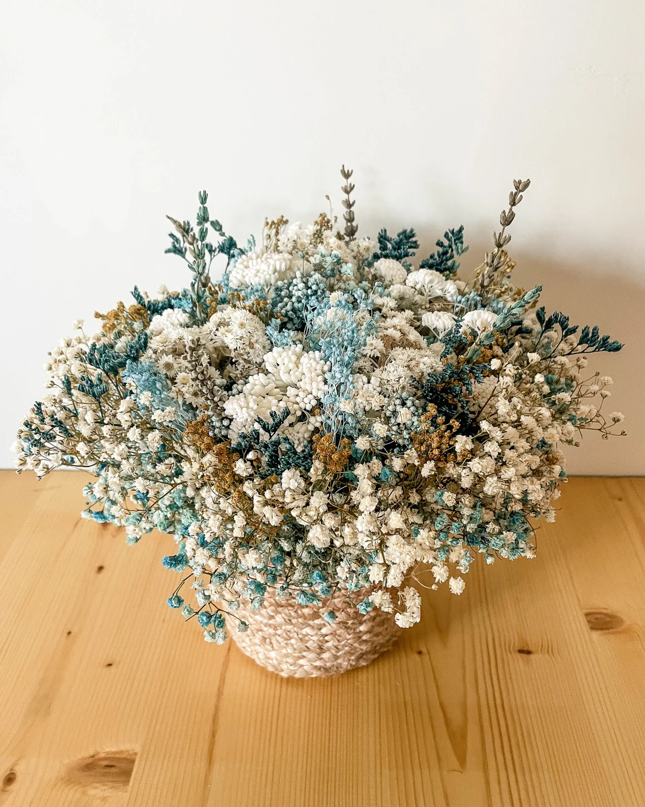 Cesto de juta natural com arranjo de flores secas e preservadas.