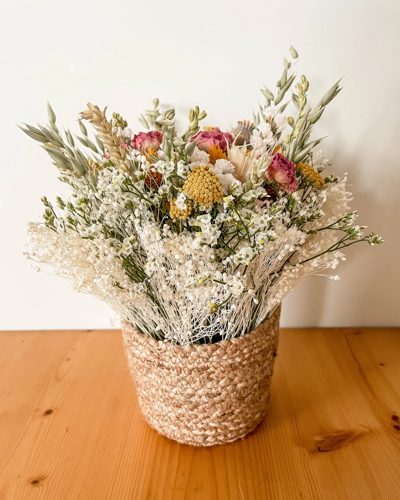 Cesto de juta natural com arranjo de flores secas e preservadas.