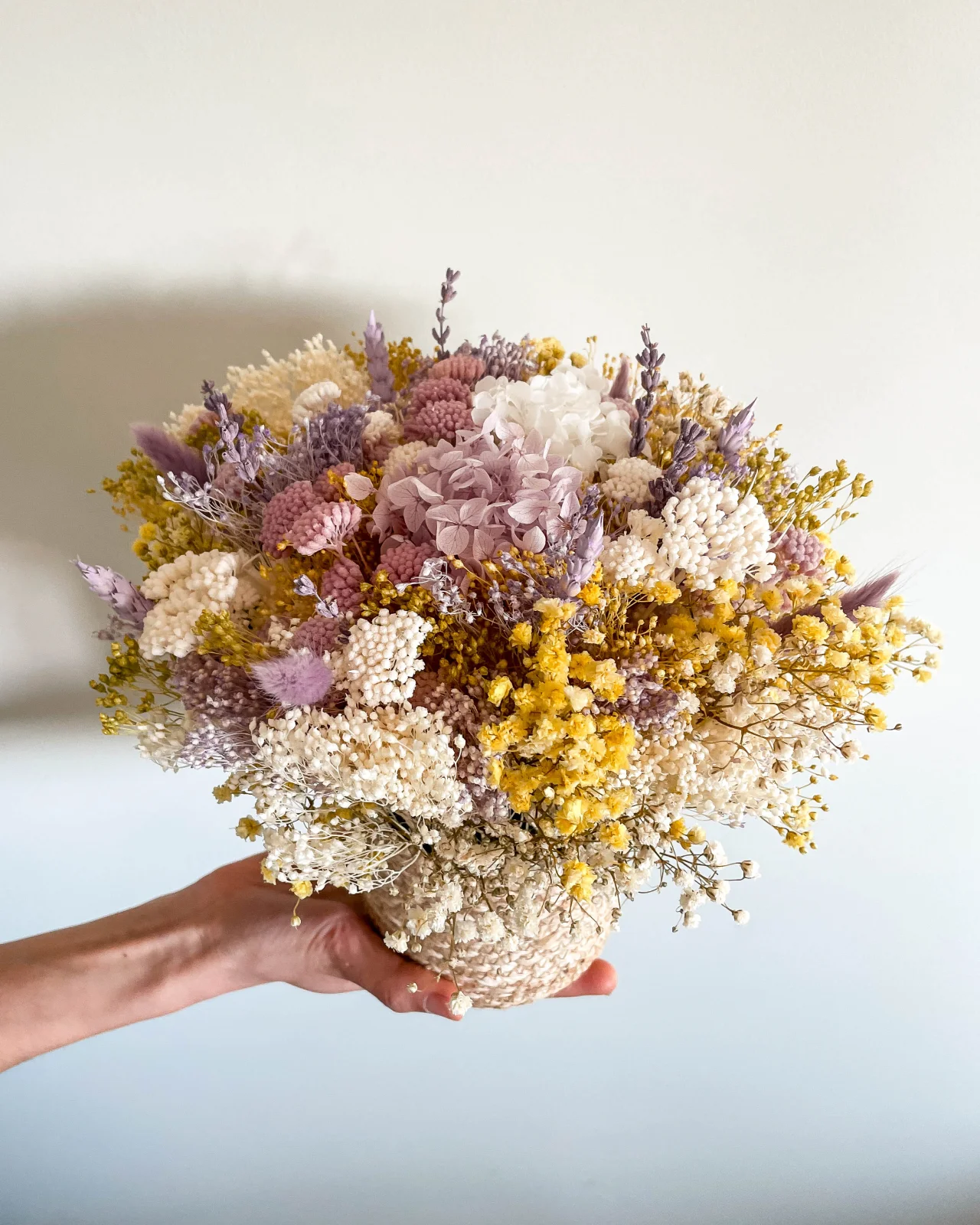 Cesto de juta natural com arranjo de flores secas e preservadas.