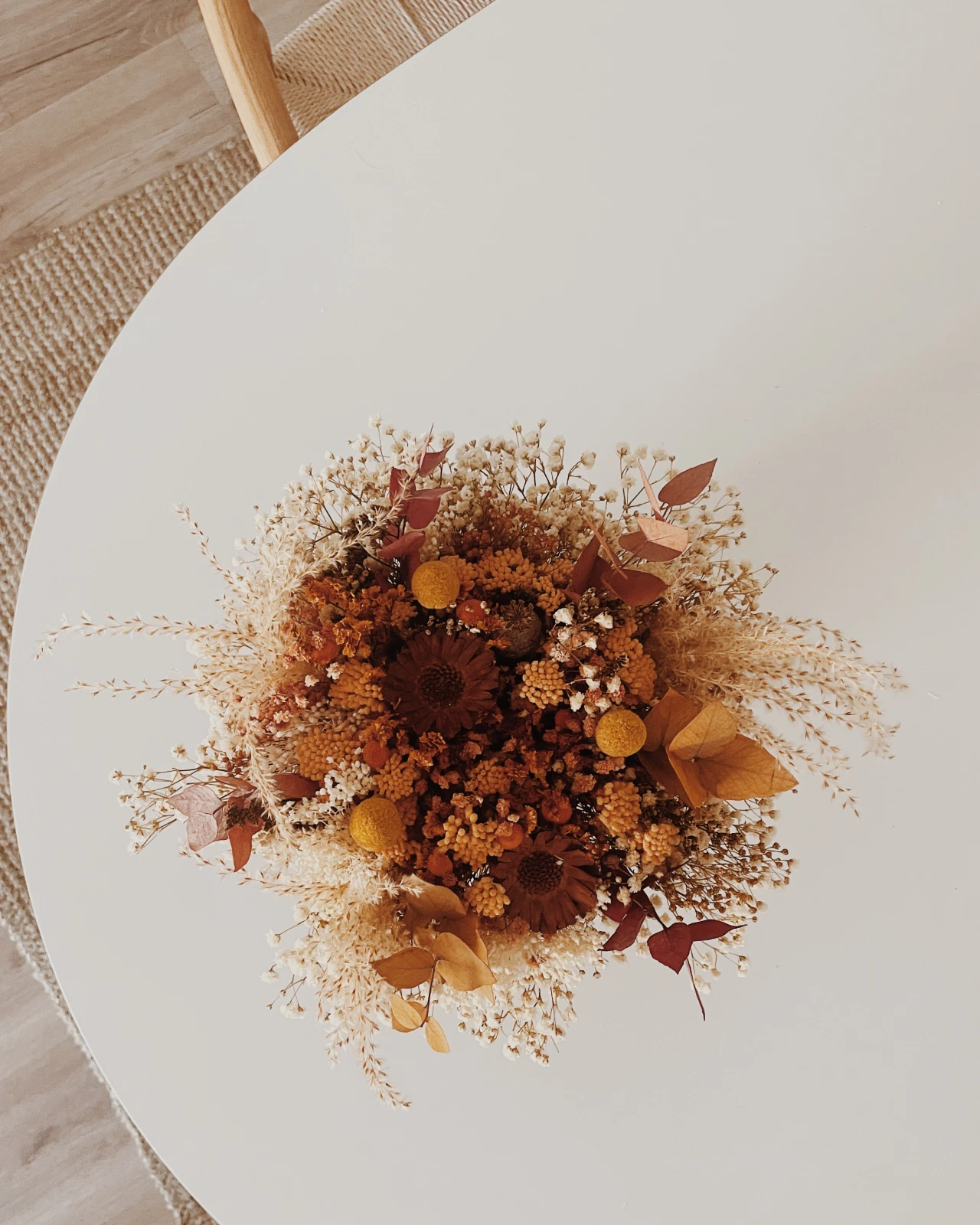 Cesto de juta natural com arranjo de flores secas e preservadas.