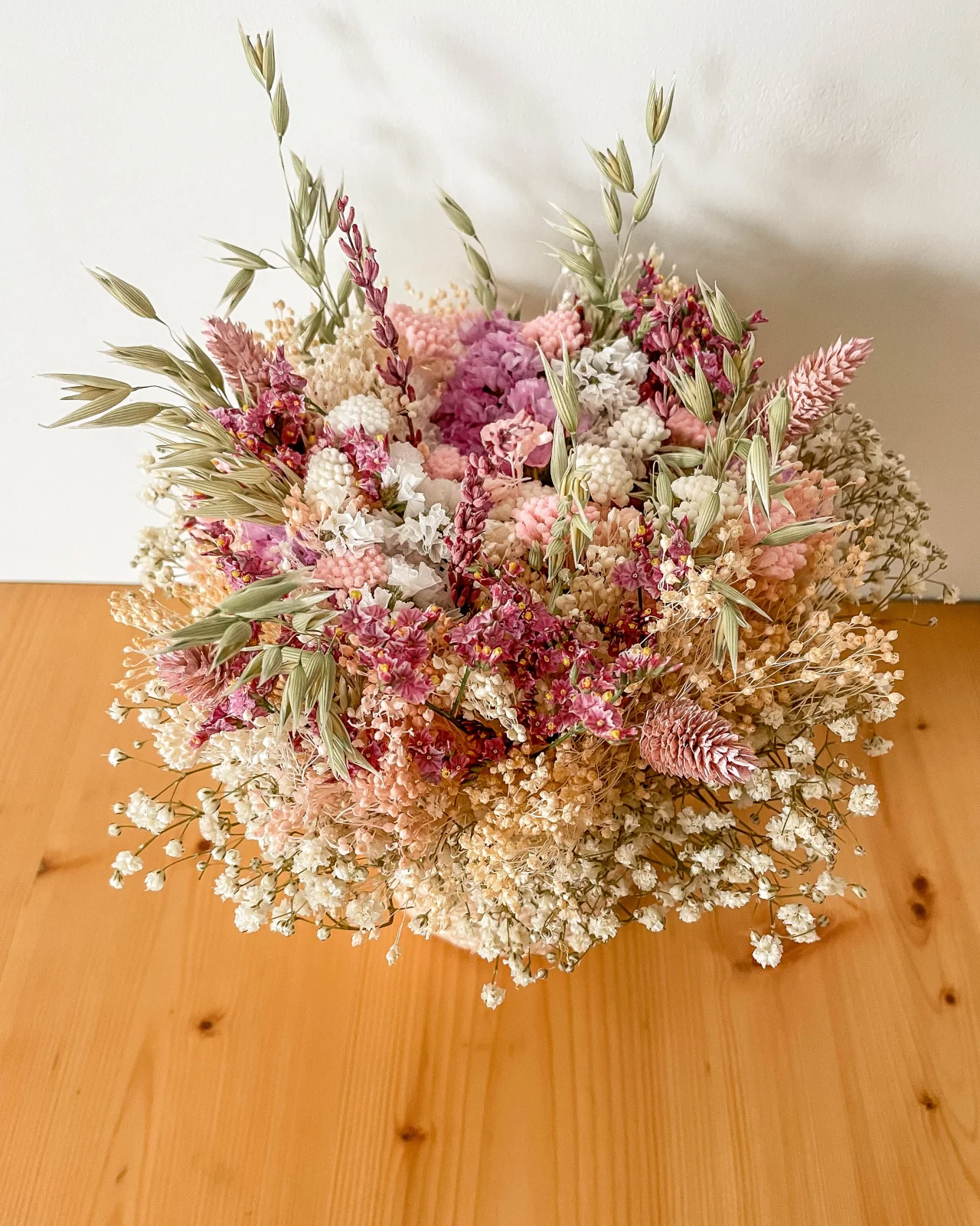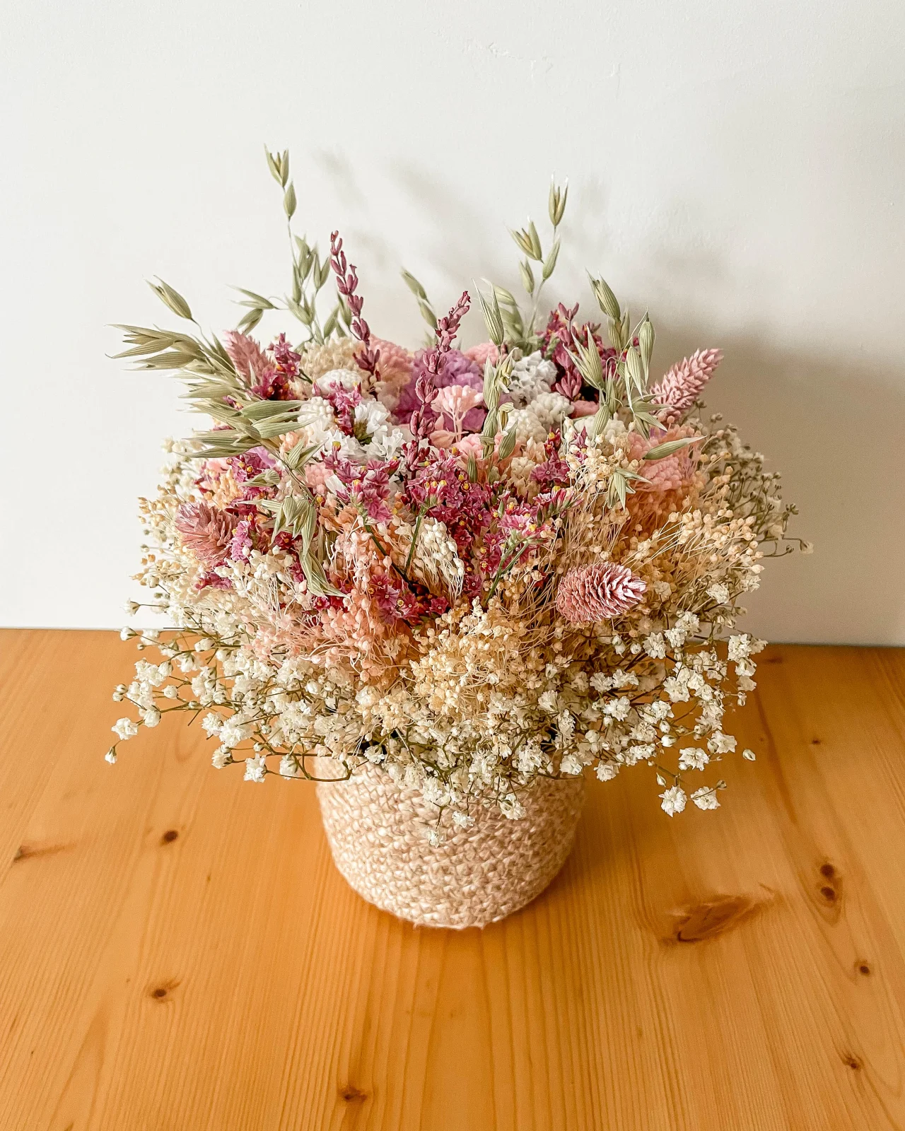 Cesto de juta natural com arranjo de flores secas e preservadas.